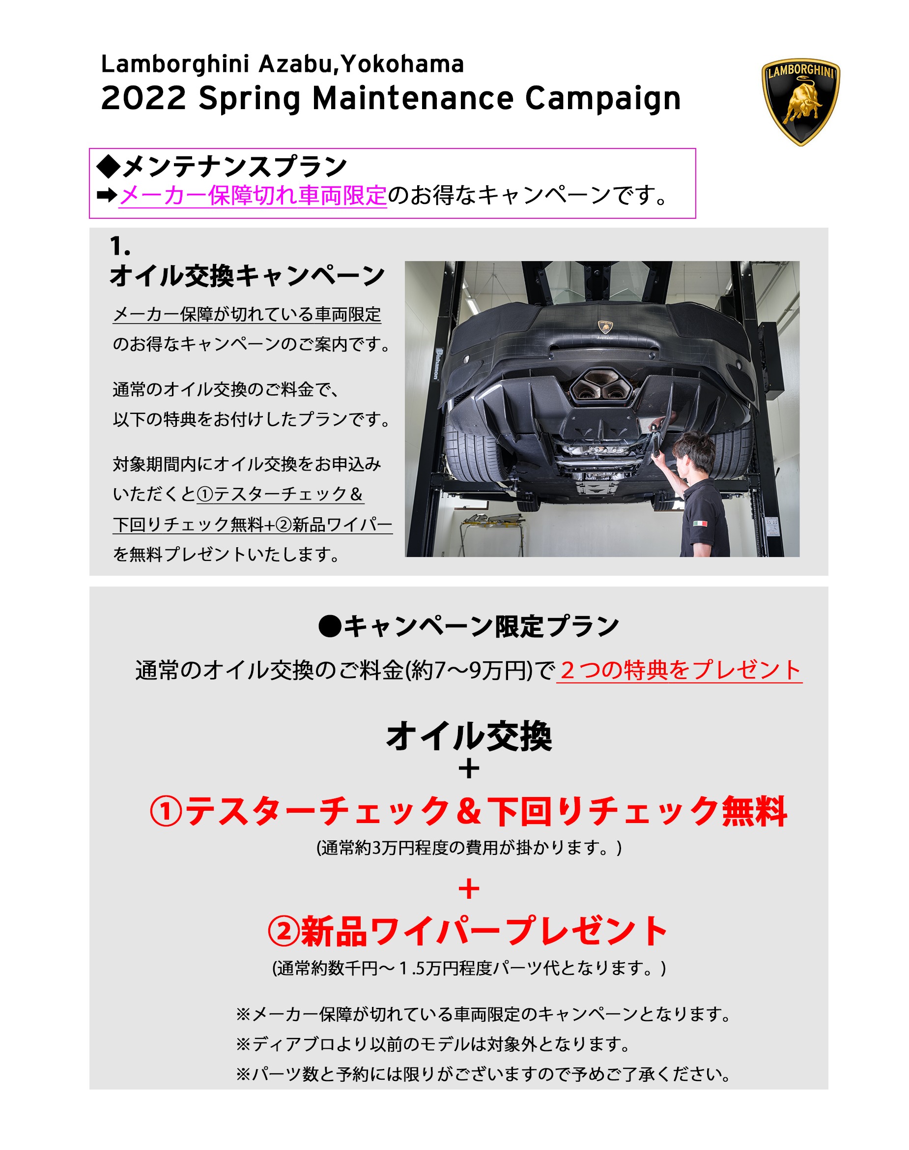 ランボルギーニ麻布・横浜・目黒では、Spring Maintenance Campaign 2022のご案内しております。