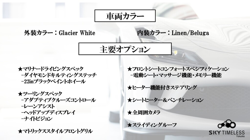 | 状態について | 【AIS検査評価点】 総合評価:5点 (外装:A 内装:A) ※車両状態の詳細に関しましては、お電話またはご来店にてご確認いただけますと幸いでございます。 ● SKY TIMELESS Fukuoka:092-477-3660 ● |